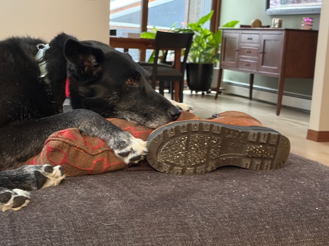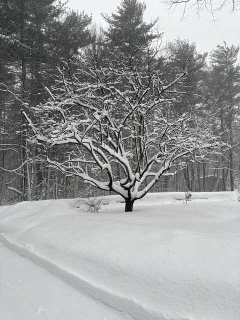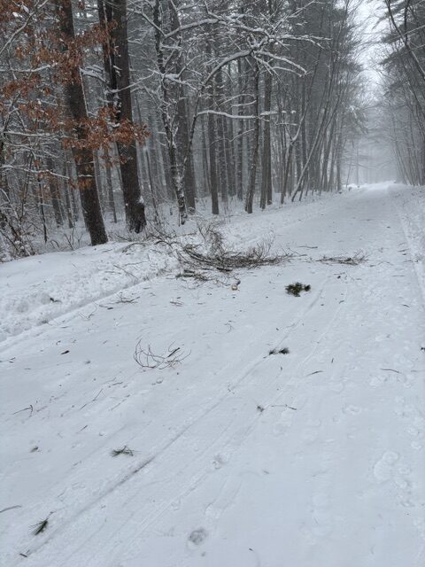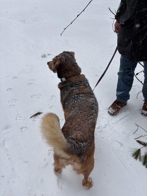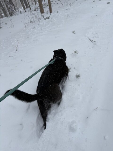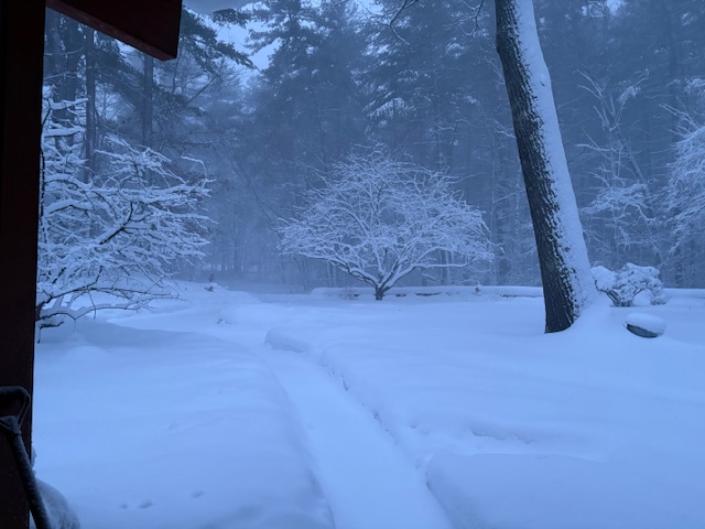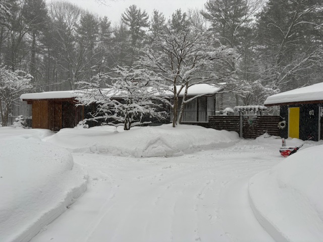 Andy stayed down here Tuesday and Thursday, but he went up Wednesday and yesterday — mostly staying inside by the wood stove fire. The roads have been clear, but the wind was almost too much for him outside.