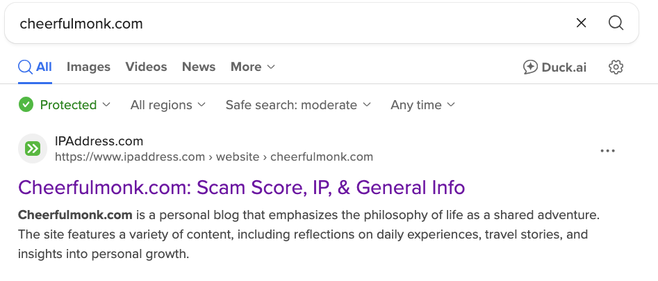 I decided to make sure that worked so I tried going to cheerfulmonk.com straight from DuckDuckGo, the search engine I use (unlike Google it preserves privacy). But when I tried it, this is the first thing that came up: