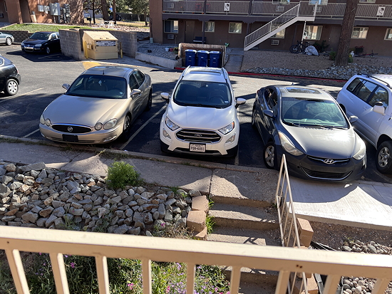 Those parking spots were full, but duh! I noticed one was open in front of the stairs we use now. (The picture taken after I parked the car.)
