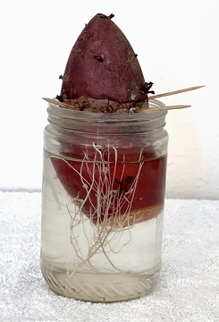 The roots of the sweet potato are growing, and the top is starting to spout.