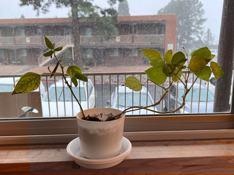 Notice the snow outside! The picture was taken yesterday morning when we had a brief snow shower. Then the sun came out and the snow melted.